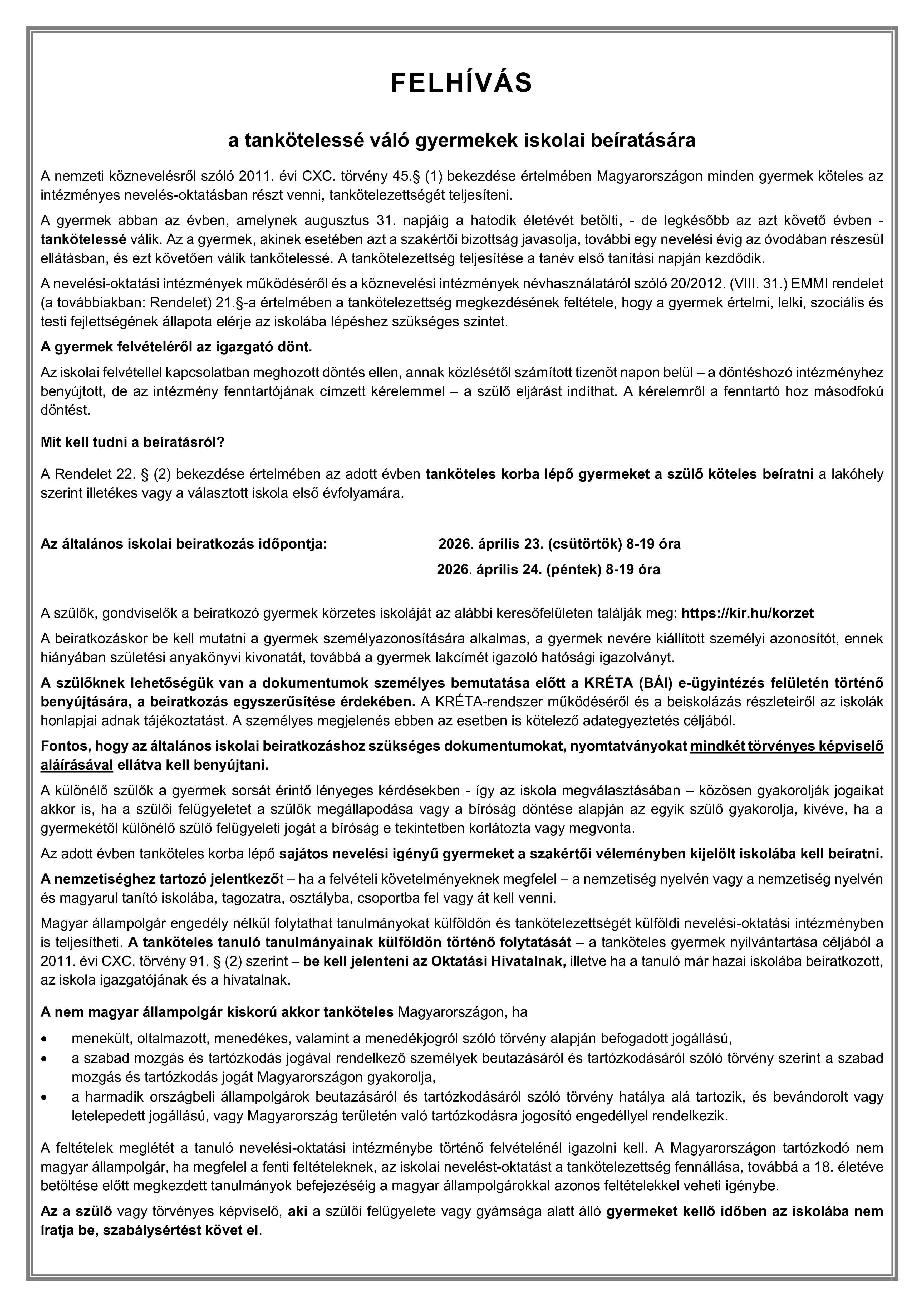 FELHÍVÁS a 2026-2027. tanévi általános iskolai beiratkozásra